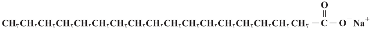 2- صابون را میتوان نمک سدیماسید چرب دانست. فرمول همگانی این نوع صابونها که جامد هستند، R–COONa بوده که در آن R یک زنجیر هیدروکربنی بلند است. ساختار زیر نوعی صابون را نشان میدهد. با توجه به آن به پرسشها پاسخ دهید.