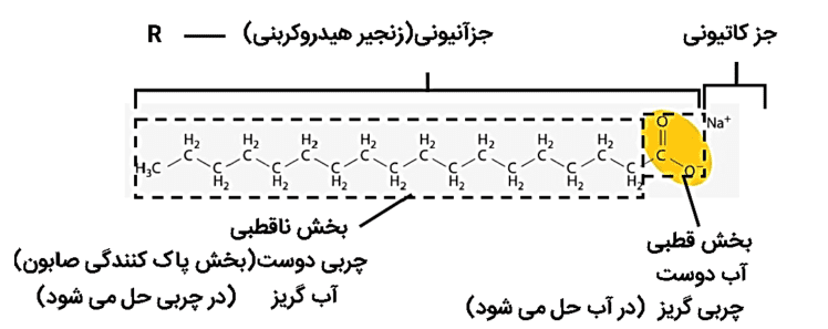 در شکل بالا بخش آبدوست و بخش آبگریز مشخص شده است، دلیل آن نیز این است که بخش قطبی صابون با یک حلال قطبی (مانند آب) محلول شده و بخش ناقطبی صابون در آب محلول نبوده و اصطلاحا آبگریز میباشد و با مواد ناقطبی (مانند چربی) تشکیل محلول میدهد.
