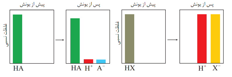 2- نمودارهای زیر غلظت نسبی گونههای موجود در محلول این دو اسید را پیش و پس از یونش نشان میدهند.
