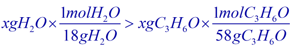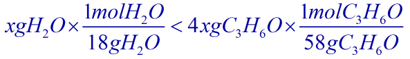 حال مشخص میکنیم به ازای x گرم آب و 4x گرم استون، تعداد مولهای کدام، با توجه به جرم مولی آنها بیشتر است: