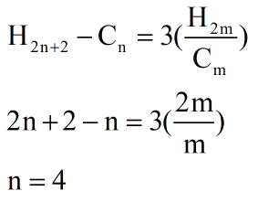 فرمول عمومی آلکانها (مانند آلکان X) به صورت CnH2n+2 بوده و فرمول عمومی آلکنها (مانند آلکن Y) به صورت CmH2m میباشد، پس با توجه به اینکه اتمهای تشکیلدهنده آنها یکی هست و تنها تفاوتشان در تعداد اتمهایشان هست، خواهیم داشت: