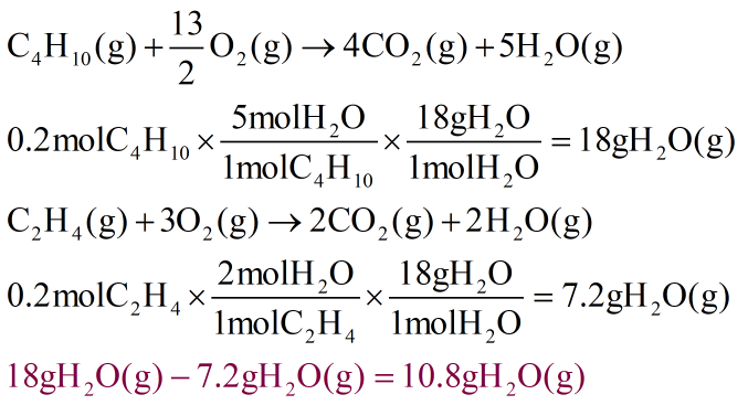 در نتیجه فرمول آلکن Y به صورت C2H4 میباشد، حال با استفاده از معادله سوختن آنها و استوکیومتری، تفاوت بخار آب تشکیل شده این دو هیدروکرن را به دست میآوریم: