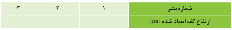 - محتوایات هر سه بشر به مدت ۳۰ ثانیه و با سرعت یکسان هم زده شد. ارتفاع کف ایجاد شده در هر بشر اندازهگیری و در جدول زیر ثبت شد.